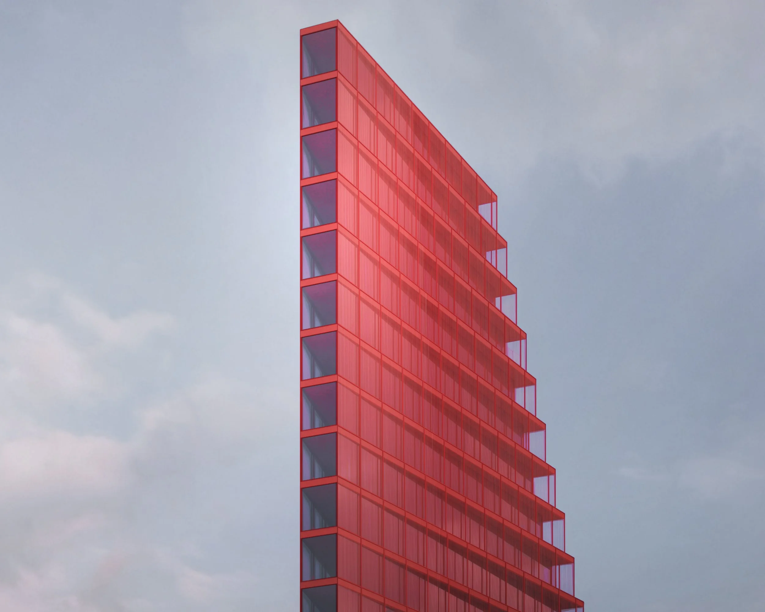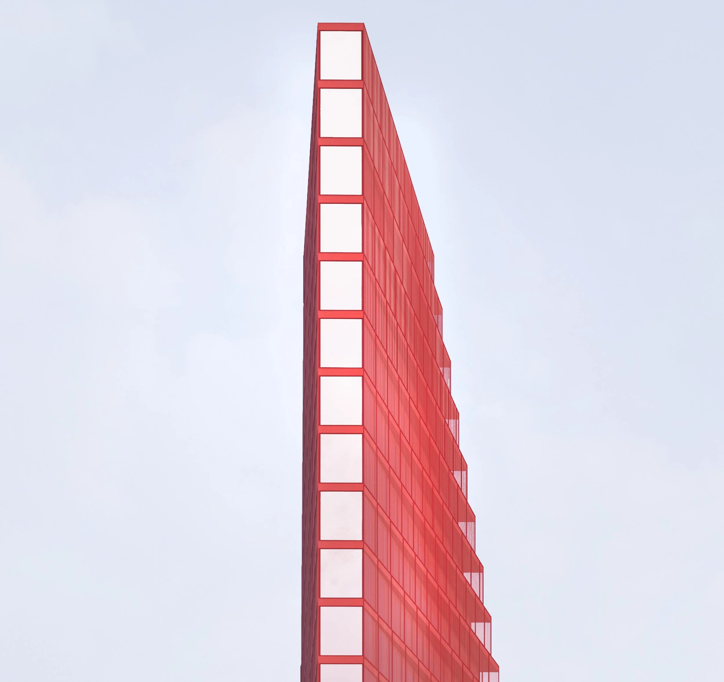 The cascading volume creates space for balconies and a shading system, while also evoking the image of a curtain gently descending down the steps.